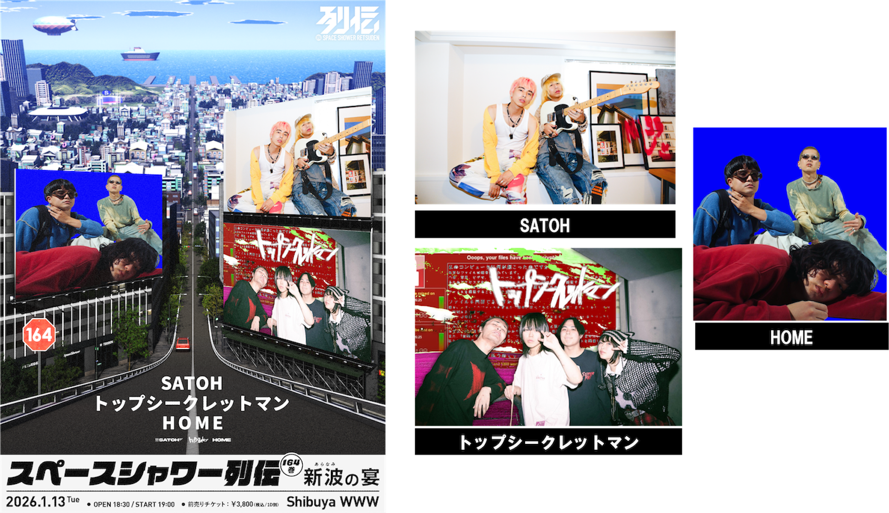 音楽専門チャンネル「スペースシャワーTV」の運営や音楽フェスティバルの企画・運営など、音楽関連事業を多角的に展開する株式会社スペースシャワーネットワーク(本社:東京都渋谷区、代表取締役社長:名取達利)は2026年1月13日(火)にShibuya WWWにて「スペースシャワー列伝 第164巻 –新波の宴-」を開催、SATOH、トップシークレットマン、HOMEの3組が競演します。